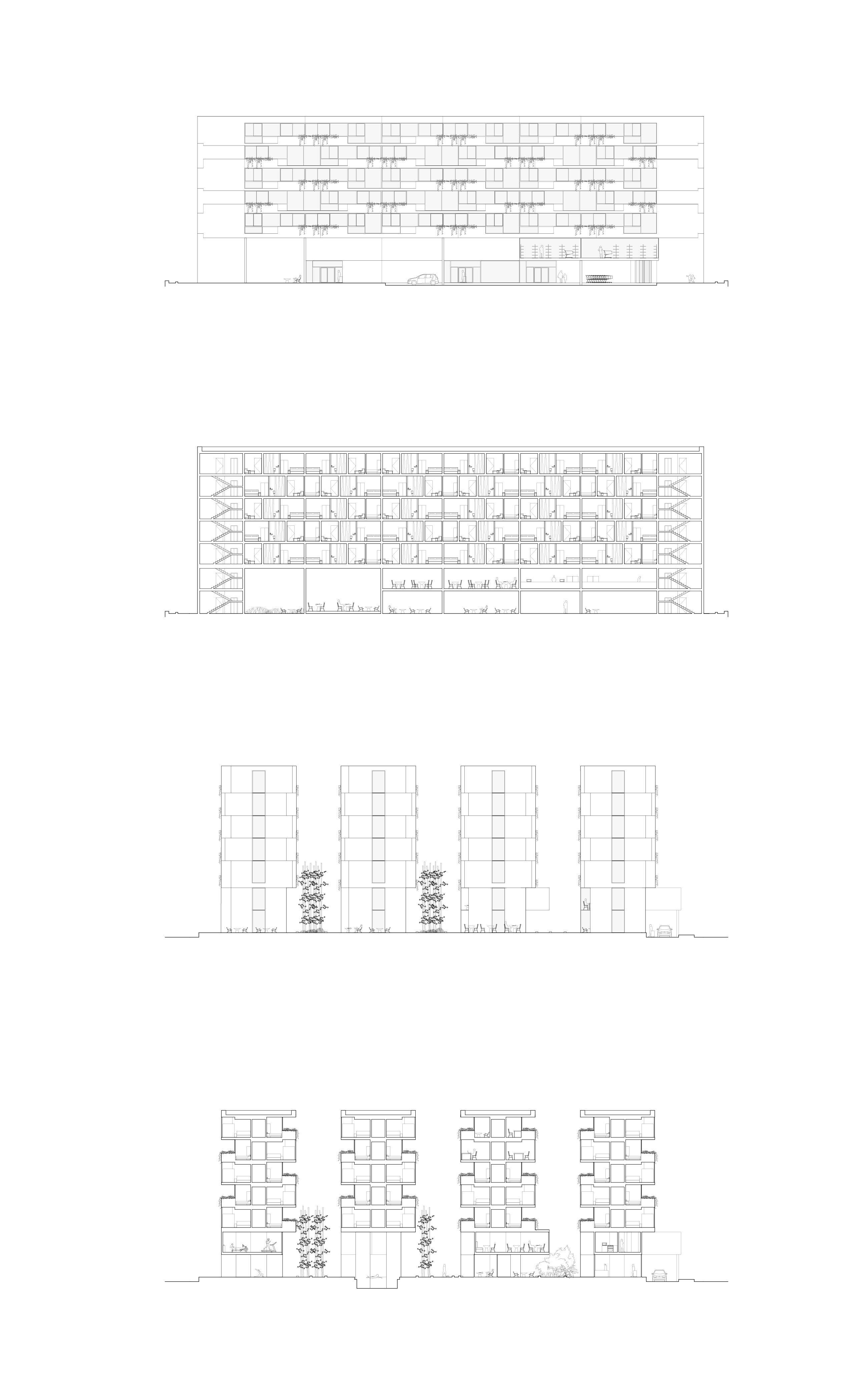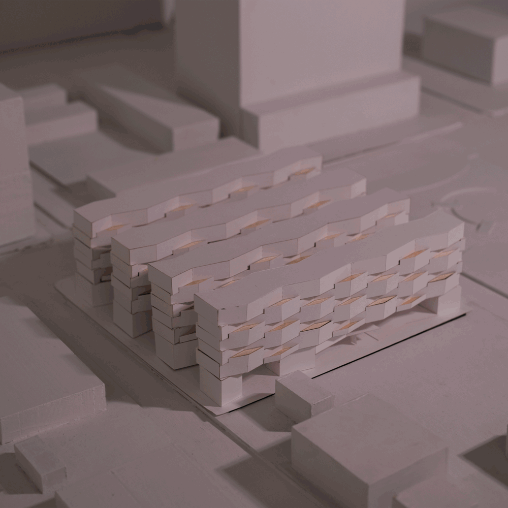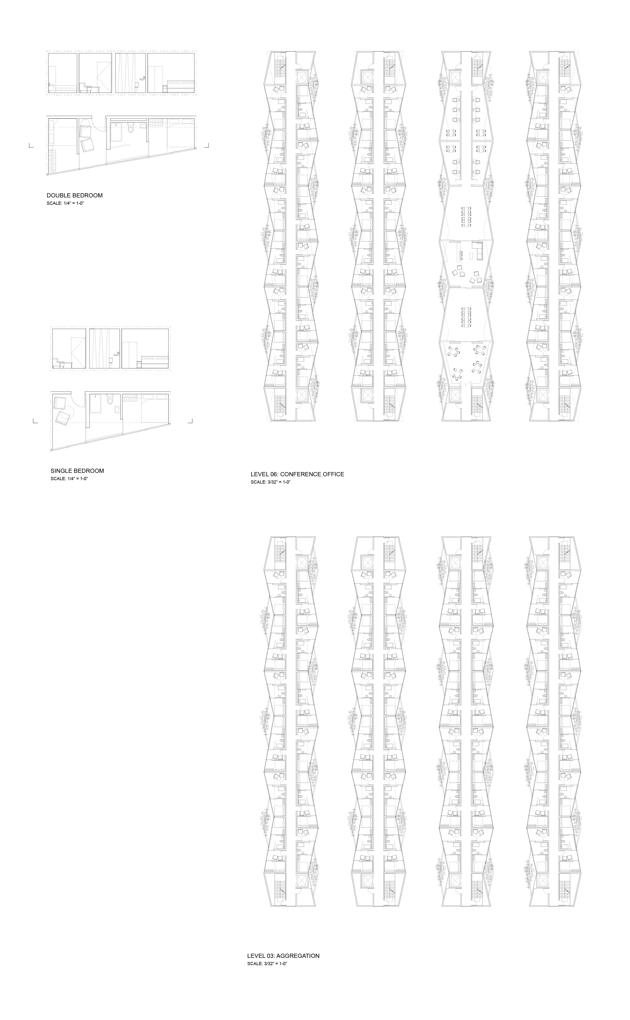 Situated next to Montrose Blvd and right before the US 59 highway, the site is between the intersection of Midtown and the Museum district. This hotel proposal started with an analysis of the population who will inhabit it: a family of three to four on vacation or colleagues on a business trip. I believe that privacy within the hotel room would benefit both populations, so I separated the two beds with a bathroom and a living. The slant of the wall generated a variation of space that a rectilinear room cannot achieve. When aggregating the units, I maintained a single circulation hallway with interwoven facades.