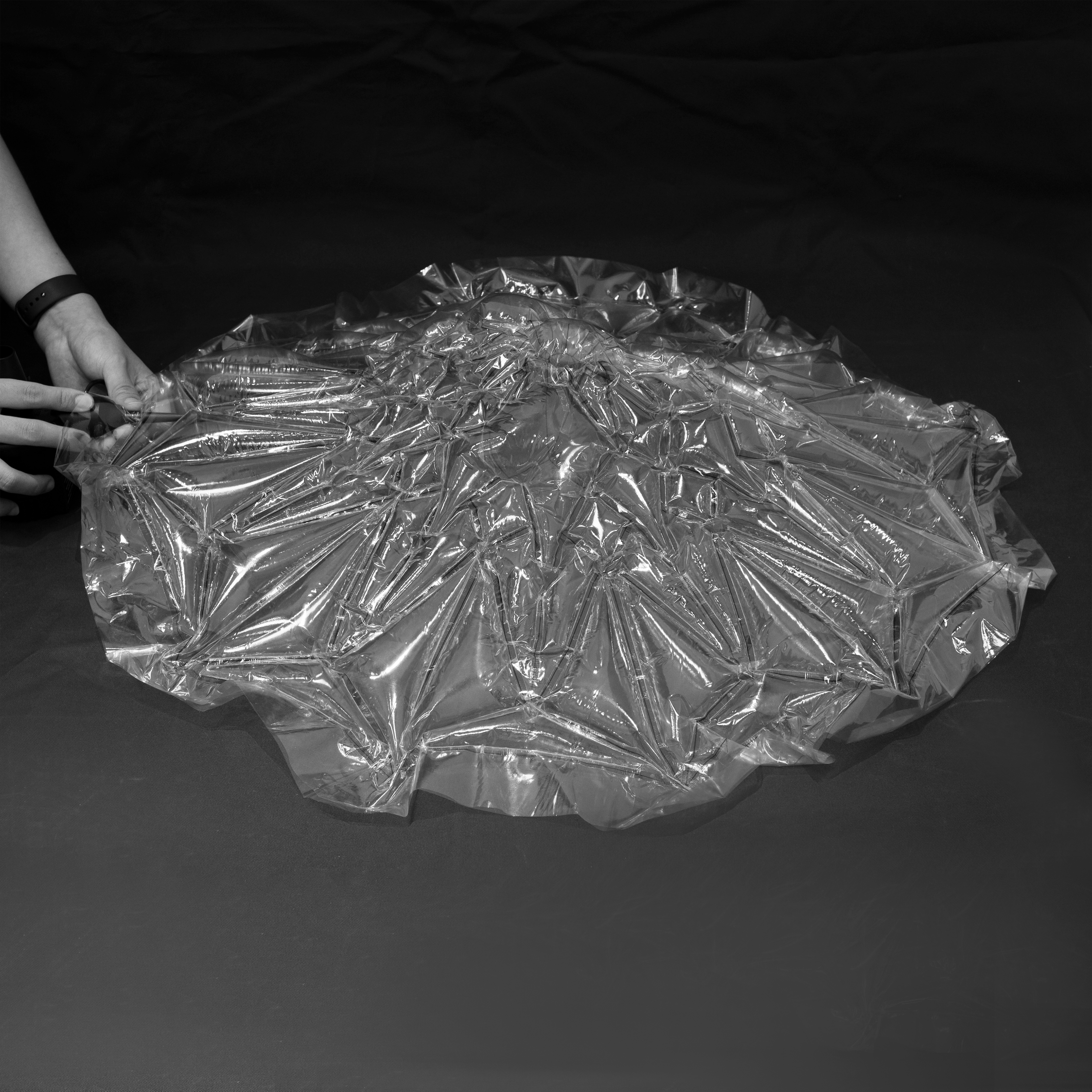 In the final prototypes, we predicted that the combination of various sizes would generate form when inflated. In a circular formation, we created a dome-shaped structure by placing the large shapes on the outside and the smaller ones towards the center. When air is pumped, the force shrinking the large air pockets pushed the center upwards, in turn creating a dome. In the final two prototypes, we found two dome-like forms through a series of two-dimensional pattern explorations.